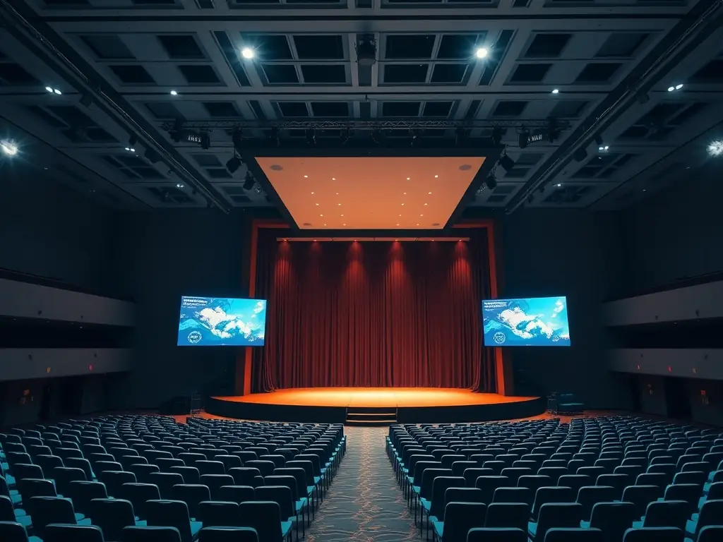 - Duża sala konferencyjna z dynamicznym oświetleniem i wieloma ekranami wyświetlającymi prezentacje.