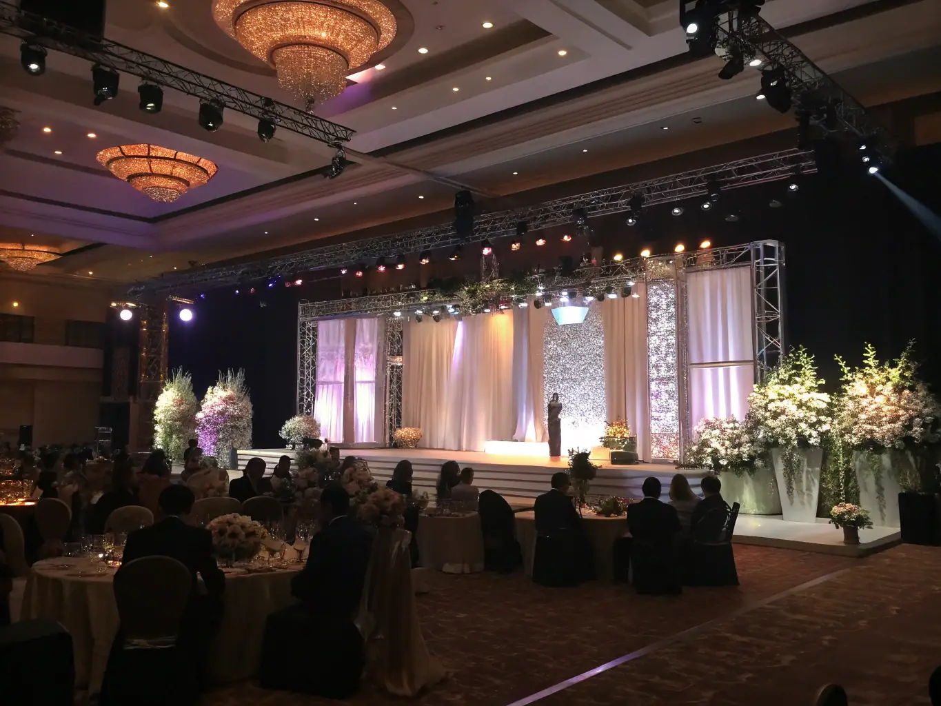 - Efektowna, udekorowana scena z oświetleniem punktowym skierowanym na prelegentów i wykonawców.